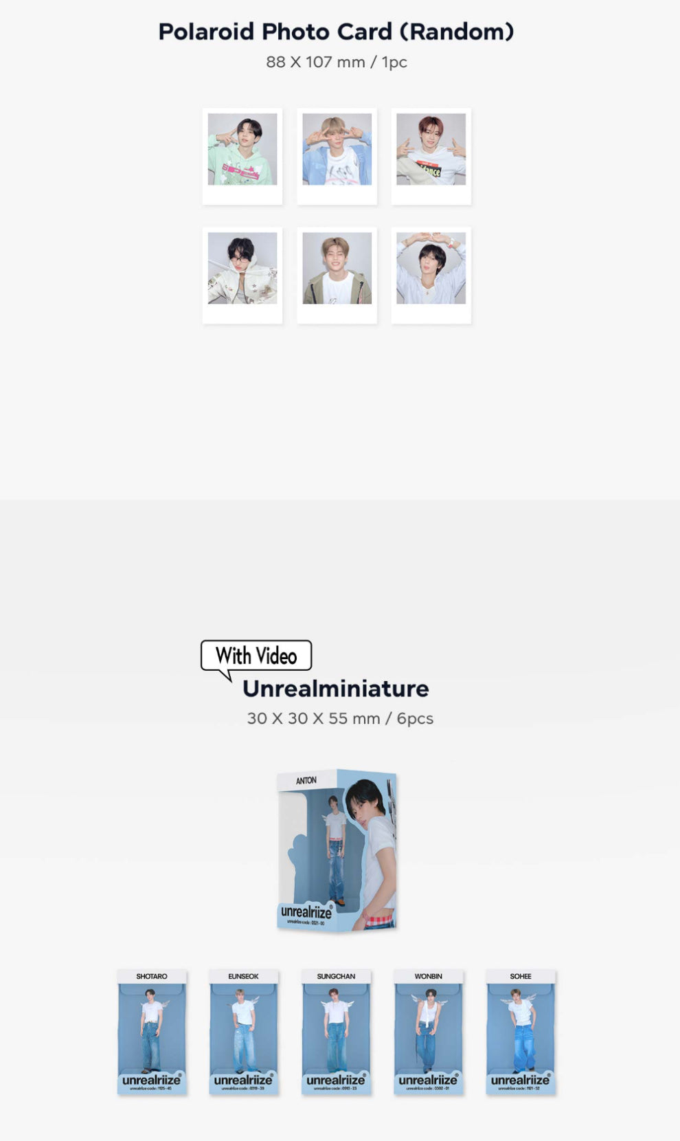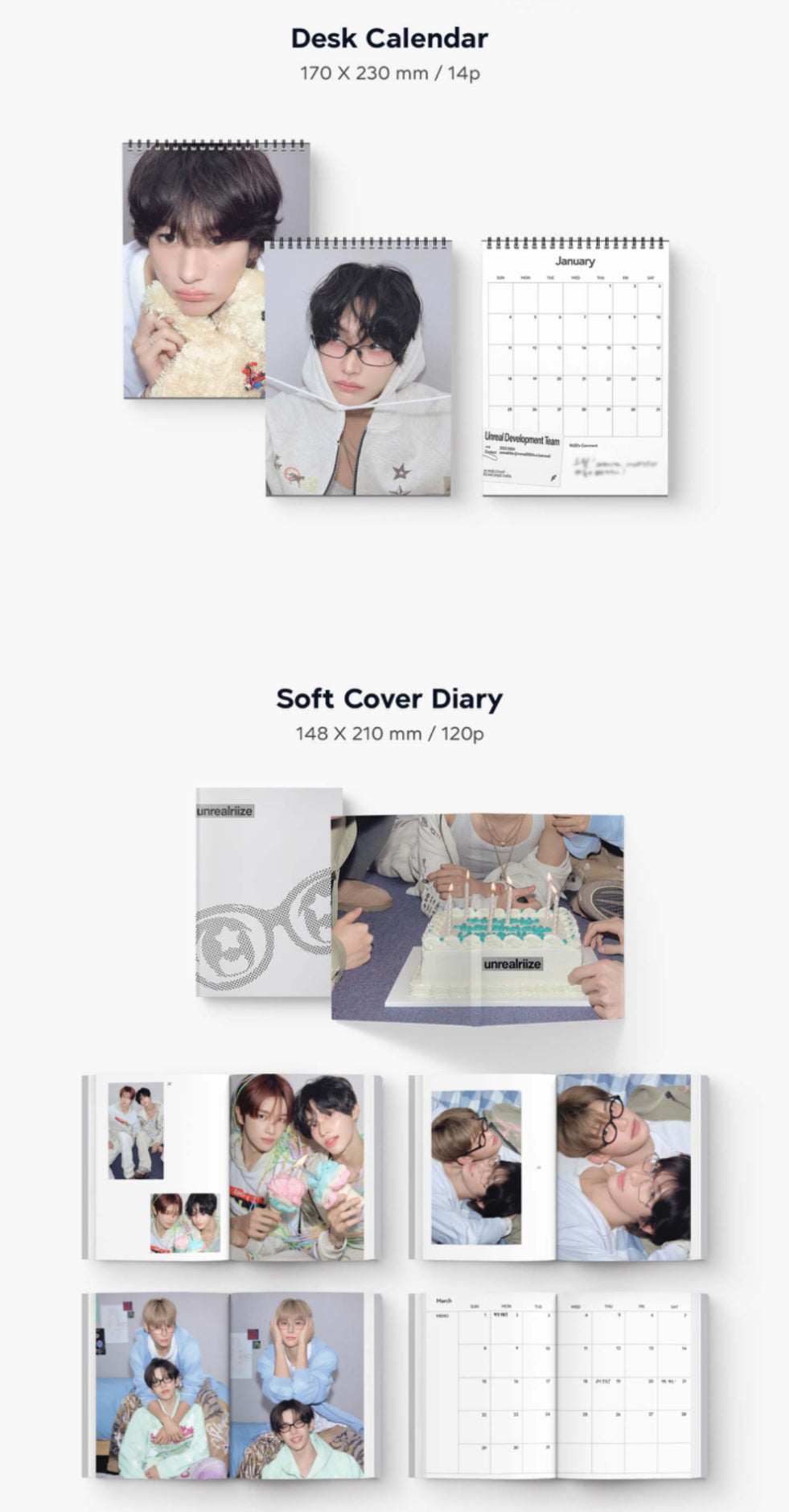 Components :Package 1PC, Desk Calendar 1PC, Soft Cover Diary 1PC, Folded Poster Set 2PCS, A4 Poster Set 12PCS, Brochure 1PC, Postcard Set 6PCS, Photo Card Set 13PCS, Gel pen 1PC, Polaroid Photo Card (Random)1PC, Season's Greetings Card 1PC, Unrealminiature 6PCS, Unrealriize completion manual 6PCS, Developer RIIZE Deco Photo Set 1PC, Unrealriize Metal Keyring 1PC, Special Selfie Pack 1PC, Unrealriize Birthday Bag 1PC
