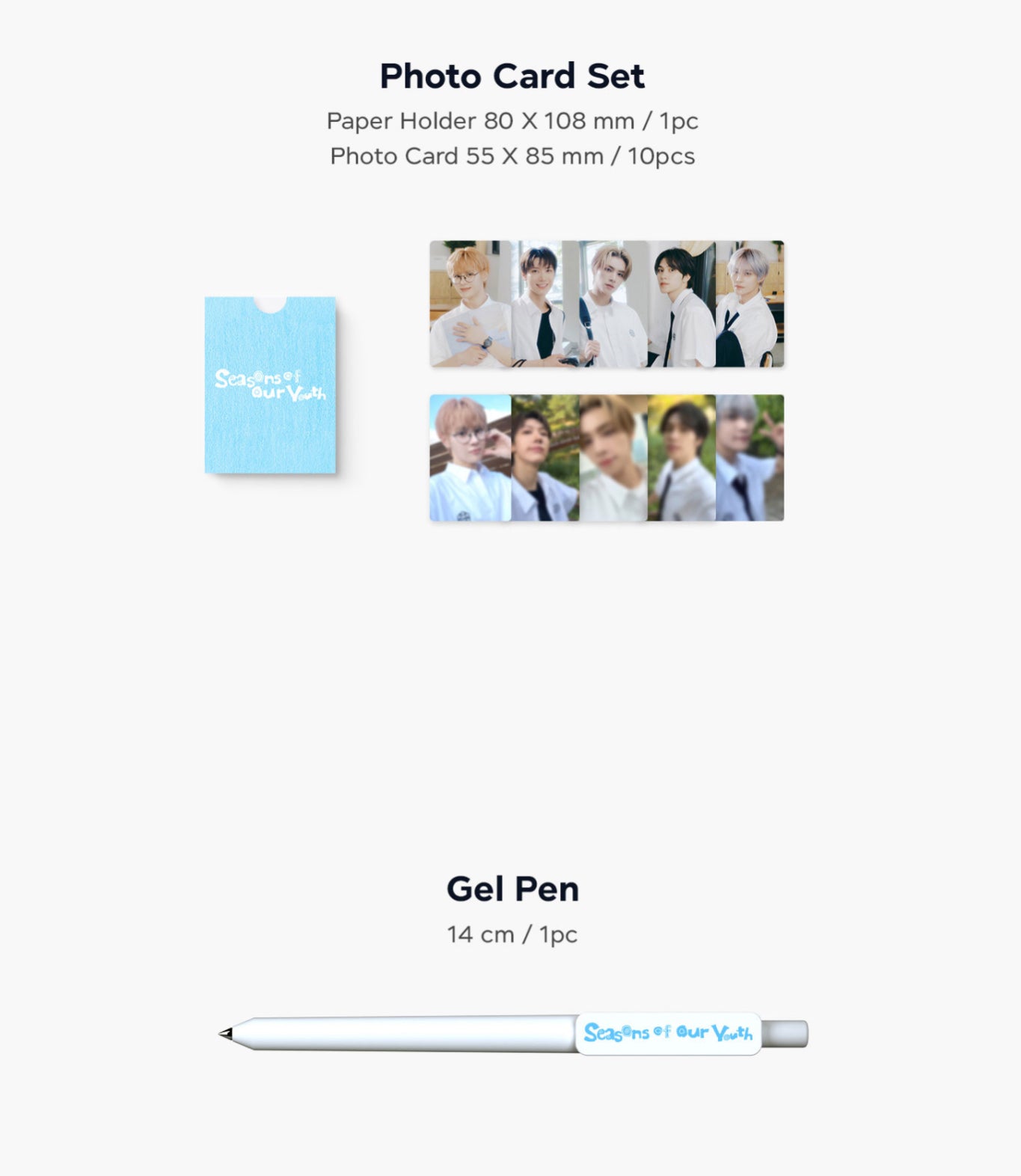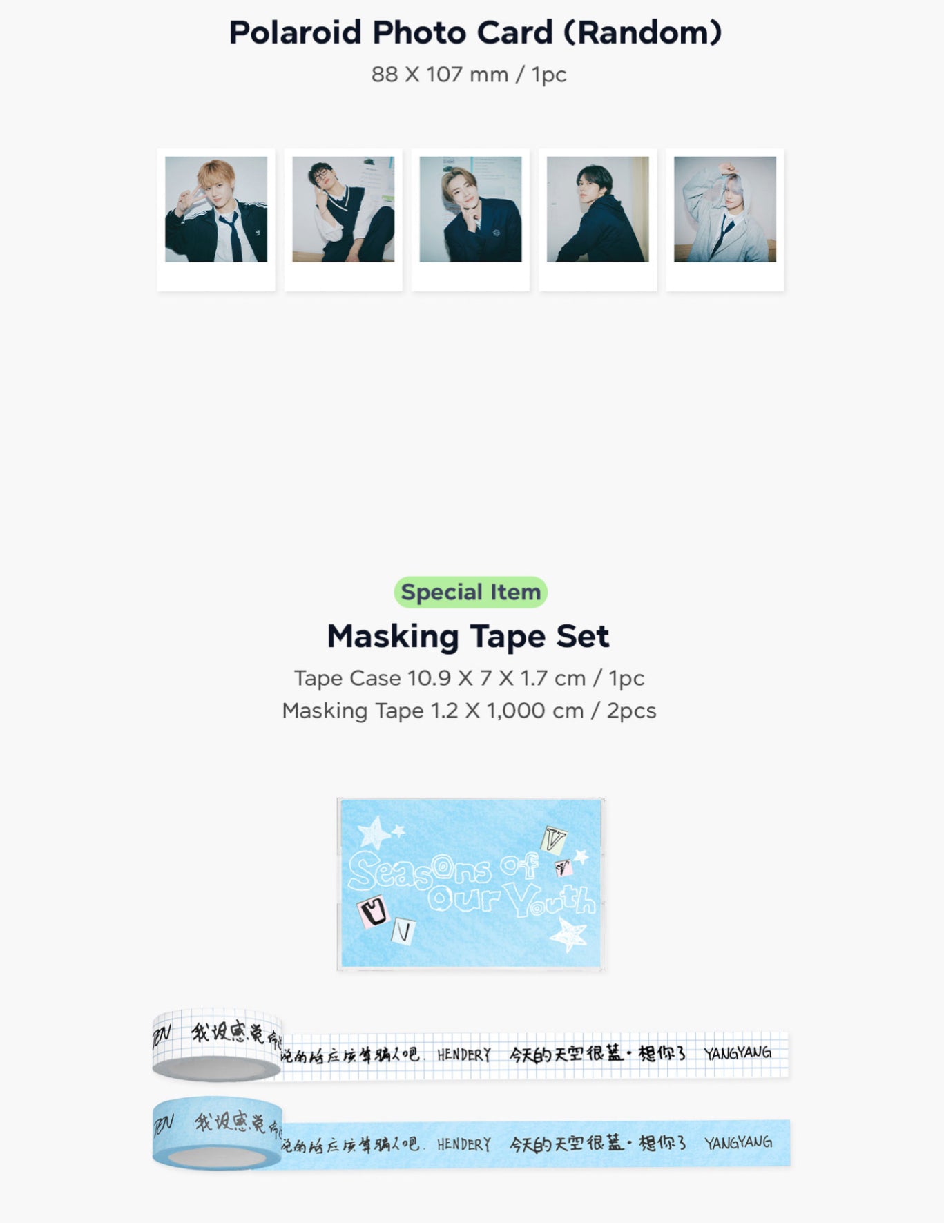 Components :Package 1PC, Desk Calendar 1PC, Soft Cover Diary 1PC, Folded Poster Set 2PCS, A4 Poster Set 11PCS, Brochure 1PC, Postcard Set 11PCS, Photo Card Set 11PCS, Gel pen 1PC, Polaroid Photo Card (Random) 1PC), (Special) Masking Tape Set 1PC